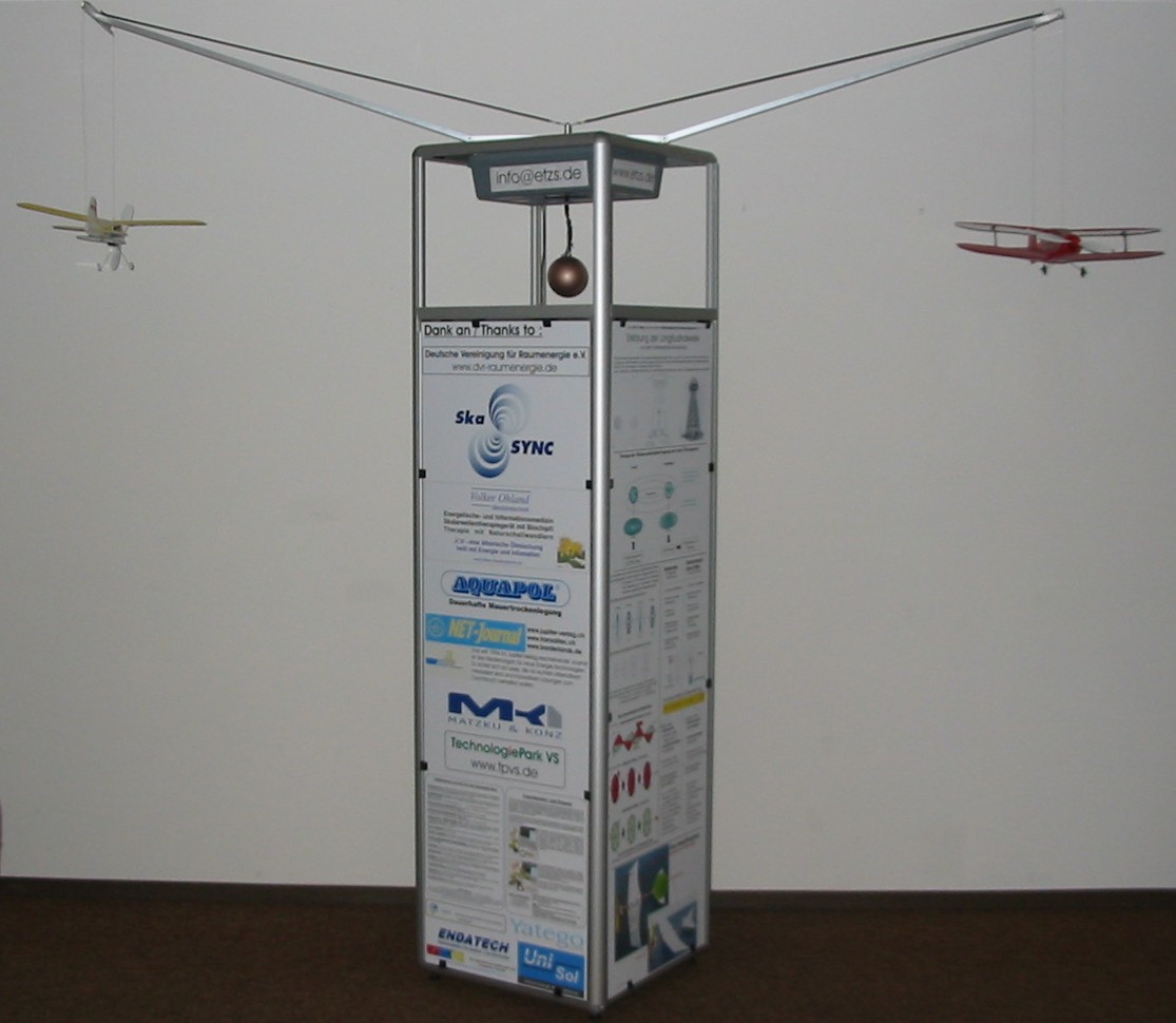 Dieses Schaumodell zeigt eine Energieübertragung von einem Sender zu zwei Fesselflugzeugen. Diese kleinen Flugzeugmodelle